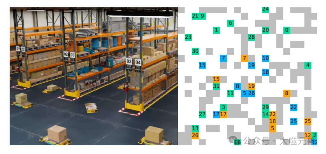 图1:现实世界中的多智能体场景和包含众多移动机器人的网格地图。在网格地图中,蓝色单元格表示智能体,黄色单元格表示其目标,绿色单元格表示已实现其目标的智能体。