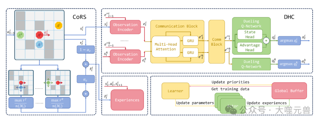 图 2:CoRS 和 DHC 算法的组合框架。CoRS 组件主要塑造奖励。DHC 组件由通信块和对决 Q 网络组成。值得注意的是,通信块采用多头注意力机制。该框架利用并行训练作为一种有效的解决方案。此过程涉及同时生成多个参与者以生成经验数据并将其上传到全局缓冲区。然后,学习者从全局缓冲区中检索此数据以进行训练,从而允许频繁更新参与者的网络。