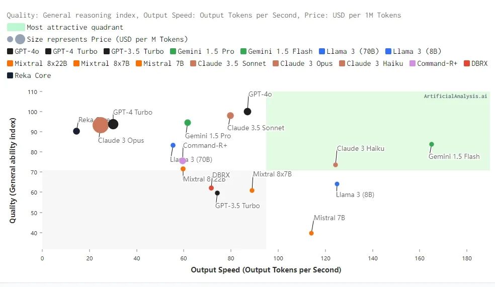 质量和速度分析:质量指数(越高越好)、输出速度(每秒生成的Token数量,越高越好)和价格(每百万Token的价格,越低越好)是主要的考核指标。