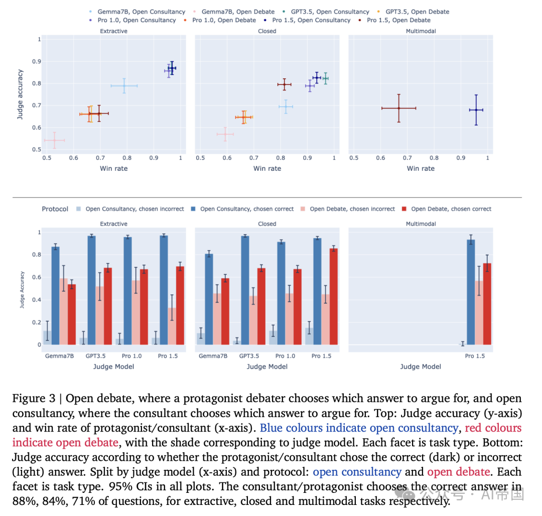 图3 | 开放式辩论与开放式咨询,其中主角辩论者或咨询者选择支持哪个答案。顶部:法官准确度(y轴)与主角/咨询者胜率(x轴)。蓝色表示开放式咨询,红色表示开放式辩论,颜色深浅对应法官模型。每个分面代表任务类型。底部:根据主角/咨询者选择正确(深色)或错误(浅色)答案的法官准确度。按法官模型(x轴)和协议划分:开放式咨询和开放式辩论。每个分面代表任务类型。所有图表中均包含95%置信区间。咨询者/主角在88%、84%、71%的问题中选择了正确答案,分别对应于抽取式、封闭式和多模态任务论文现在比较开放式咨询和开放式辩论,其中咨询者/主角可以选择一个答案来支持。在图3顶部,论文绘制了法官准确度(y轴)与主角/咨询者胜率(法官选择主角/咨询者所支持答案的比例)。蓝色表示开放式咨询,红色表示开放式辩论,颜色深浅对应法官模型。在所有任务中,开放式咨询的胜率均高于(或等于)开放式辩论,这意味着法官在咨询协议中更倾向于同意咨询者的选择,可能是因为咨询者面临的挑战不如开放式辩论中那样强大(那里有一个同等强度的对手)。然而,这并不总是导致更高的法官准确度。对于抽取式任务,开放式咨询确实比开放式辩论导致更高的法官准确度,但在封闭式/多模态任务中,论文最强的辩论法官的准确度大致相同,尽管较弱的辩论法官的准确度低于相应的咨询法官。 为了更深入地理解法官如何受到主角/顾问选择正确性的影响,在图3底部,论文绘制了开放咨询和开放辩论中法官的准确度,按顾问或辩论中的主角选择了正确(深色)或错误(浅色)答案进行划分。对于开放咨询,当顾问选择正确时(深蓝色),法官的准确度较高,而当顾问选择错误时(浅蓝色),准确度较低。对于开放辩论,主角选择正确时(深红色)法官的得分高于选择错误时(浅红色),但差异不如开放咨询情况中那么极端。对于可扩展监督训练而言,最重要的是弱法官能够注意到强模型何时出错。在这方面,论文可以更清楚地看到开放辩论的优势——当辩论主角选择错误时(浅红色),弱法官在开放辩论中的准确度远高于开放咨询中顾问选择错误时(浅蓝色)。然而,这确实会导致当辩论主角选择正确时,准确度相对下降。在未来的工作中,探索一种双方辩论者都有真正开放选择的开放辩论版本将会很有趣,他们可以选择为同一个答案辩论,这可能会进一步提高法官的准确度。论文现在分析辩论者的相对说服力,动机源于辩论作为一种可扩展的对齐训练协议。作为训练模型在辩论游戏中获胜的agents,论文转而考虑辩论模型在说服裁判(仅推理辩论)方面的相对强度,并研究这与裁判准确性的相关性。与仅使用单一模型作为辩论者(Pro 1.5)的第4.1节和第4.2节相比,论文现在使用一系列辩论者,并通过测量他们的交叉对战胜率(裁判选择他们答案的频率)和用Elo评分模型他们的潜在技能,研究这些与裁判准确性的相关性,遵循与Khan等人(2024)类似的设置。论文的发现总结是,较强的辩论模型(按Elo评分衡量)往往会导致略高的裁判准确性,尽管效果相对较小。要点是,这对于辩论作为一种可扩展的监督协议是一个弱正向的指示——尽管人们可能希望看到对裁判准确性的更强影响。Elo评分 论文生成一系列同时辩论中的1轮论点(即仅开场论点),包括五位辩论者:Gemma7B、GPT-3.5、Gemini Pro 1.0、Gemini Pro 1.5(所有BoN=1)和Gemini Pro 1.5(BoN-4)。然后论文从中抽取512个样本(每个数据集贡献相等),研究辩论者的说服力与裁判准确性的关系。