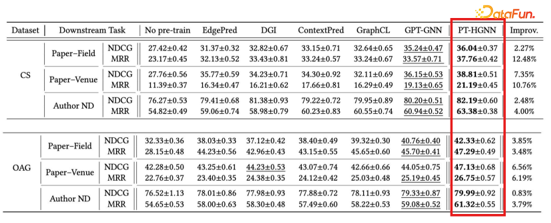 从以上数据可以看到,相比其他预训练模型,PT-HGNN 的性能有着显著提升。