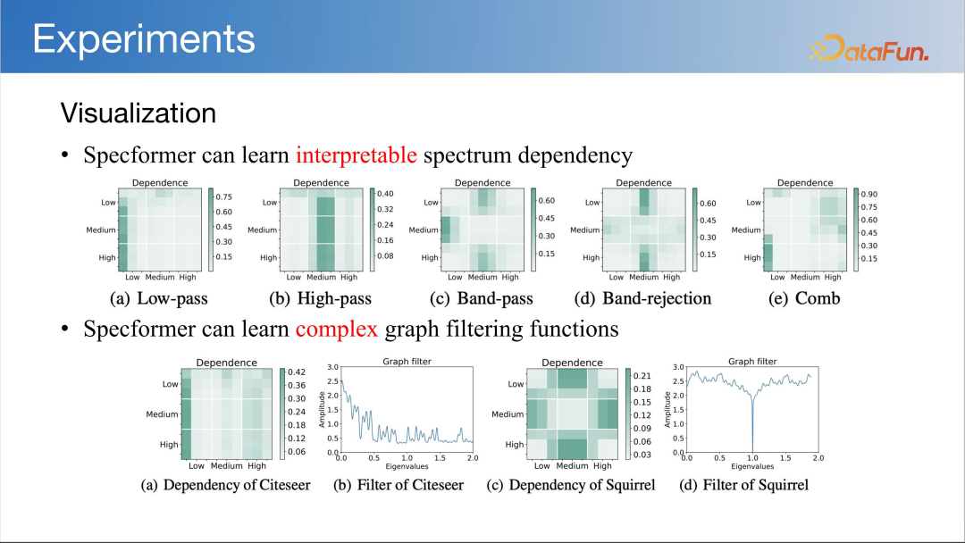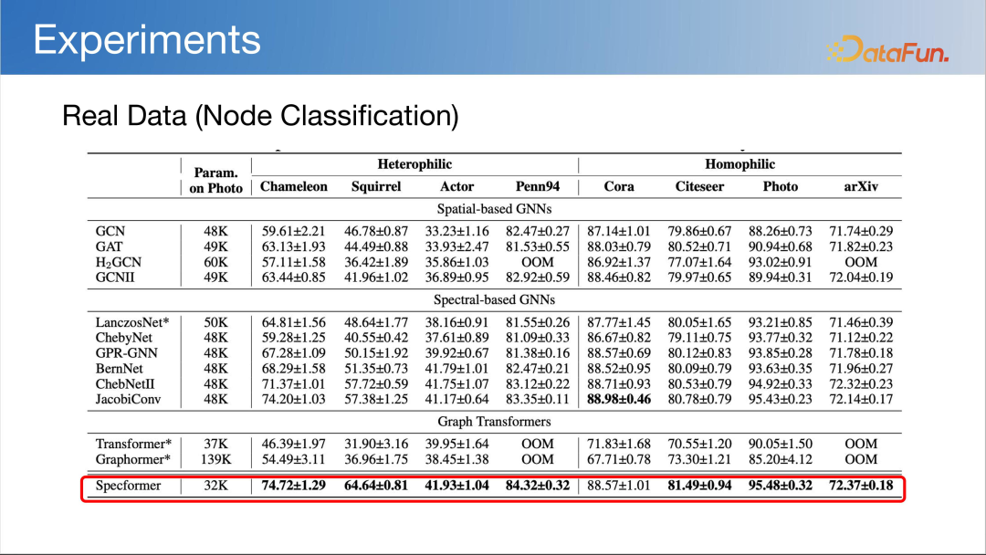 Specformer 通过其 Transformer 架构的自注意力机制:- 能够识别出哪些特征值对图的表示学习更为重要,以及这些特征值是如何相互作用的。这样的学习过程可以帮助模型更好地理解和处理图数据,从而在图分类、节点分类、链接预测等图机器学习任务中取得更好的性能。同时,这种对谱特性的深入理解也为研究人员提供了一种方式,使得他们能够解释模型的行为,而不是仅仅将其视为一个“黑箱”。