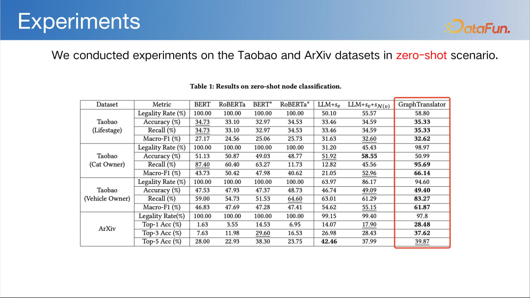 在淘宝和 ArXiv 数据集上进行了零样本场景下的实验,可以看到 GraphTranslor 有着显著的提升。