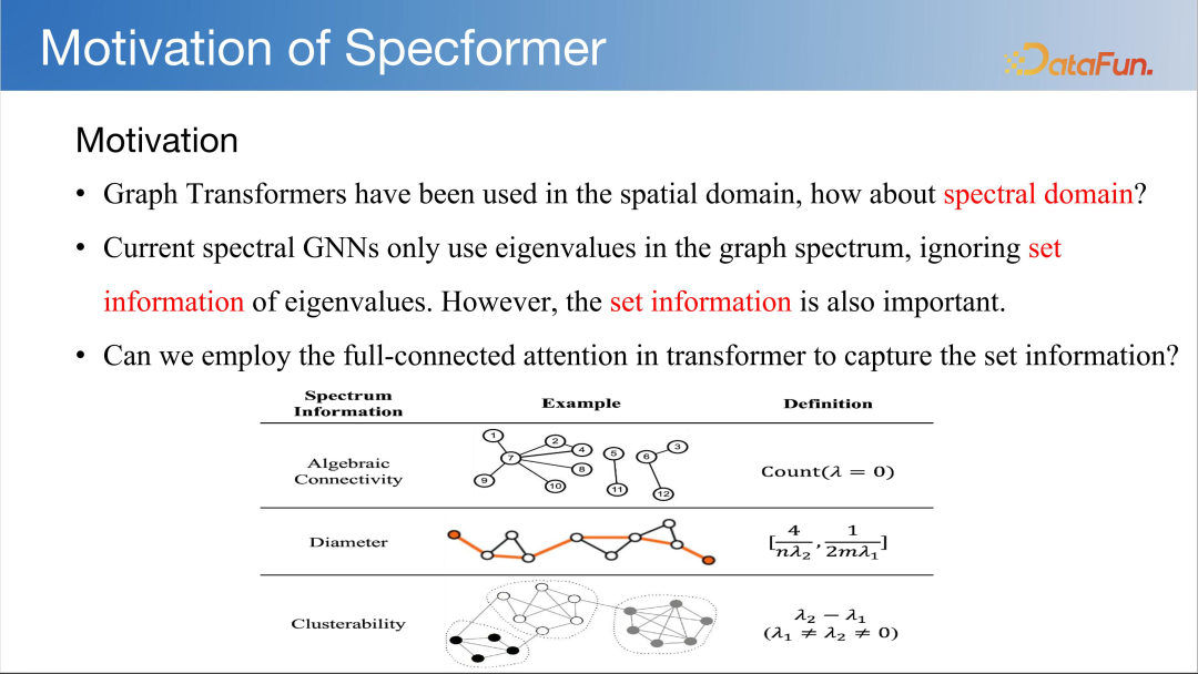 Graph Transformer 已经应用于空域中,还未用于谱域。目前的谱域 GNN 仅使用图谱中的特征值,忽略了特征值的集合信息,但集合信息也是很重要的。因此我们希望能够利用 Transformer 中的全连接注意力来捕获集合信息。