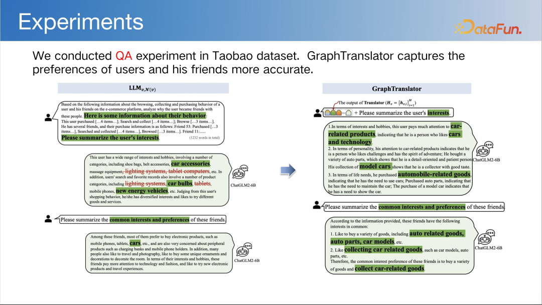 还在淘宝数据集中进行了 QA 实验。GraphTranslator 能够更好地捕捉用户及其朋友的偏好,从而给出更准确、更丰富的回答。