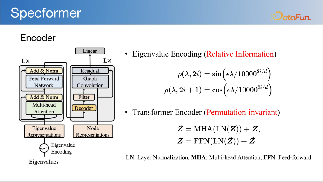 编码部分,将特征值编码与 Transformer 结合起来,意味着在图神经网络中使用 Transformer 架构来处理经过特征值编码的节点表示。这样的结合可能旨在利用 Transformer 的强大能力来捕捉图结构中的复杂关系,同时保持对图的谱特性的敏感性。