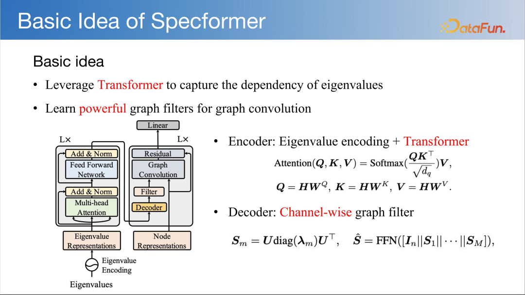 Specformer 的基本思想是利用 Transofrmer 刻画特征值之间的依赖,学习一个表达能力强的图滤波器,用于图卷积。
