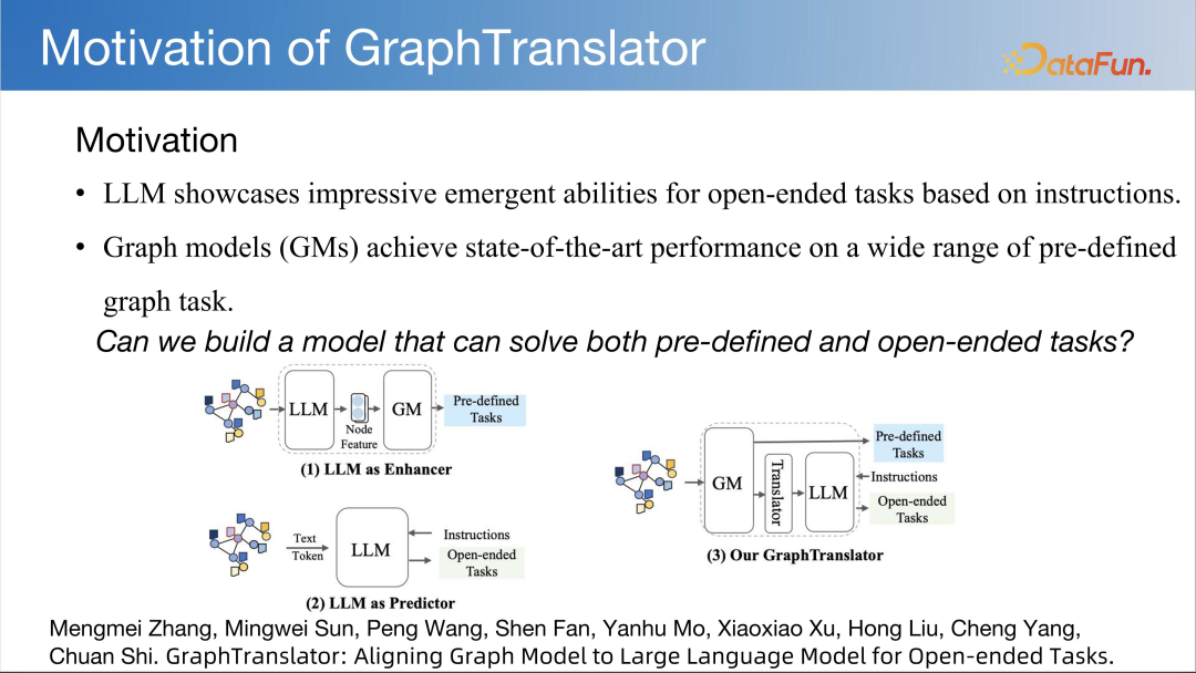 下面介绍的 GraphTranslator 属于图基础模型三种技术中的第三类,即图模型与大语言模型相结合。这一工作的动机为:- LLM 展示了在基于指令的开放式任务中令人印象深刻的涌现能力;