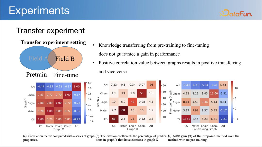 我们还验证了其知识迁移能力,即在一个领域做训练,在另一个领域做预测。从上图中可以看到,计算机与材料、工程、化学的相关性是比较强的,但与艺术领域的关联性是很弱的,是负关联。通过知识迁移实验发现,结构相关的情况下知识迁移会表现较好。结构越相关,知识迁移能力的提升越明显。这也说明了结构知识的迁移是一件很困难的事情。