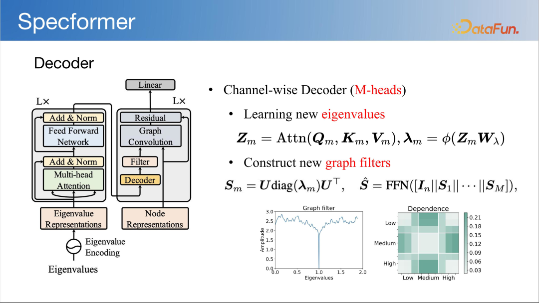 通道级解码器:Specformer 引入了一个通道级解码器(Channel-wise Decoder),它不仅学习新的特征值,而且构建新的图滤波器(Graph