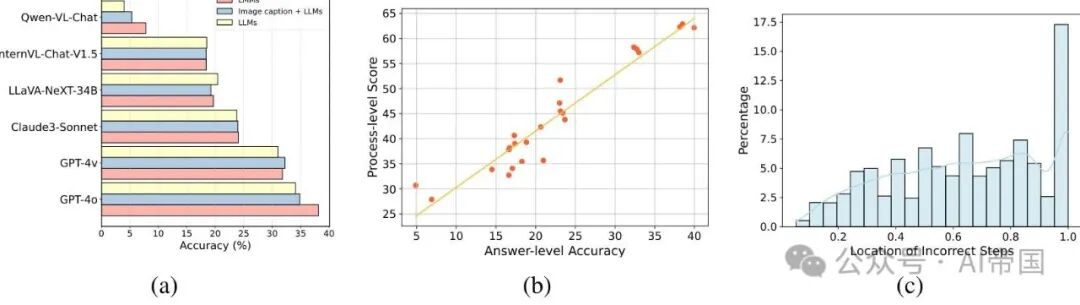 图 4:(a) 不同LMMs及其对应LLMs在三种不同实验设置下的比较。关于每个LMM对应的LLM的详细信息,请参阅附录C.2。(b) 所有模型在所有采样问题上的答案级和过程级得分之间的相关性。(c) 错误步骤位置的分布,表示为在整个过程中从左到右的步骤比例,覆盖所有采样问题过程级评估结果分析 通过过程级评估(完整结果见表14),论文发现了以下见解:(1) 过程级评估与答案级评估之间通常存在高度一致性。当模型产生正确答案时,推理过程的质量往往在大多数情况下更高(见图4b)。