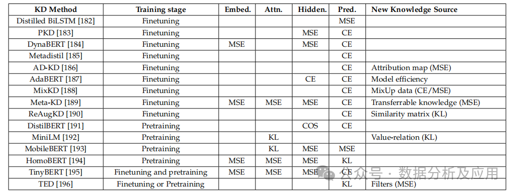 中等规模的语言模型通过预训练和微调两个阶段进行训练,其中预训练阶段使用大规模的无标签数据集学习语言的通用特征和结构,微调阶段使用带标签的数据使其适应特定任务。模型蒸馏可分为微调蒸馏和预训练蒸馏两类。微调蒸馏是在微调阶段使用知识蒸馏的方法,而预训练蒸馏是在预训练阶段使用知识蒸馏的方法。表4展示了各种中等规模模型蒸馏方法的训练阶段、知识来源和损失函数。这些方法有助于提高模型性能和泛化能力。