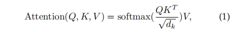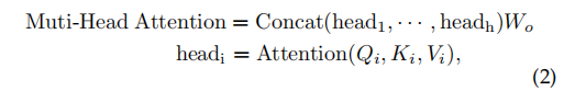 其中,权重通过Q和K的点积计算得出,√dk是一个常量的缩放因子。多头注意力。此外,Transformer采用多头注意力机制,如图1所示,而不是仅用一个键值对注意力函数。它通过不同的线性层将输入标记映射到h个不同的查询(Qi)、键(Ki)和值(Vi | i ∈ [1, h])上。最后,输出变为: