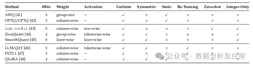 编码器和解码器。Transformer模型是一种编码器-解码器结构,用于神经机器翻译。编码器首先独立处理输入序列,解码器将编码器的输出作为输入并预测最终输出。编码器和解码器之间的两个核心区别是:编码器采用全注意力,解码器采用单向注意力;编码器采用自注意力模块,解码器采用跨注意力。随着技术的发展,除了编码器-解码器模型,还有许多后续的语言模型采用纯编码器结构和纯解码器结构。随着Transformer架构的流行,出现了许多基于纯Transformer架构的自然语言处理模型,这些模型参数越来越多。一般认为真正意义上的“大”语言模型应该从BERT和GPT-1算起,它们的参数规模都达到了数亿级别。之后出现了许多中等规模模型和大型模型,这些模型利用大规模的自我监督预训练来使模型具有许多小型模型所不具备的能力。中等规模模型参数数量在一亿或以下,而大型模型参数数量超过一亿。许多模型压缩算法(如知识传递和剪枝)在压缩后需要进行微调甚至训练来恢复精度,但对于大型模型,全参数微调和训练成本高昂。因此,参数有效的微调(PEFT)算法被提出,旨在减少微调参数或迭代次数,降低微调成本。量化方法在降低内存成本和提高推理速度方面具有优势,特别是在支持低比特数据类型的硬件上。量化方法相对于其他压缩方法具有高压缩比、低成本和高灵活性等优势。我们将介绍标准量化方法和一些基本概念,并重点介绍近年来在LLM推理方面的量化方法,包括无需重新训练的方法和需要重新训练的方法。最后,我们将讨论一些高级主题,这些主题对未来的研究具有潜力。1)均匀量化。均匀量化是一种基本的量化方法,它将实数值范围划分为均匀的有限区间,例如,对于b位整数的2b个区间。然后,同一区间内的实数值被映射到相同的整数。2)非均匀量化。非均匀量化可以提供更高的精度和更低的量化误差,但可能会因为涉及耗时的查找操作而效率低下。神经网络的权重通常不是均匀分布的,因此非均匀量化是可行的。3)剪切范围和校准。剪切范围和校准是均匀量化中的一个重要因素,选择合适的剪切范围可以减少异常值的数量,但也会导致更大的尺度系数和量化误差。常见的校准选择包括使用最小/最大值、绝对最大值或最小化信息损失。4)对称/非对称量化。对称/非对称量化是处理截断范围[α,β]的方法,当范围在0处对称时,称为对称量化;否则为非对称量化。非对称量化的剪枝范围更紧凑,对激活可能严重失衡的神经网络中的激活尤为重要。然而,在解量化步骤中,对称量化的计算效率更高。5)量化粒度。神经网络量化的分类标准是量化粒度,它对应于哪些权重/激活一起量化并共享量化参数。常见的量化粒度包括层级量化、通道量化、行/列量化、标记量化、组量化等。一般来说,更细的粒度可以减少量化误差,但需要存储更多的量化参数并引入更高的计算开销。6)训练后的量化/量化感知训练。训练后的量化/量化感知训练可以有效减少量化误差。其中,PTQ无需重新训练,而QAT需要重新训练。QAT通过模拟量化过程或微调量化模型来学习一个更好的性能点,但重新训练对于大多数研究人员来说成本高昂。7)静态/动态量化。静态量化是在推理前预先计算量化参数,通过校准输入找到典型的激活统计信息。动态量化是在运行时动态计算量化参数,通常更准确但需要较高的开销来计算所需的统计信息。8)模拟/仅整数量化。模拟量化可以减少神经网络的内存成本和数据移动时间,对于一些工作表明LLM推断是内存密集型的来说有帮助。而仅整数量化可以利用特定硬件支持的高效低位操作加速。9)仅权重/权重+激活量化。量化目标是否仅是权重还是包括权重和激活。先前的工作[21]发现,激活量化通常更容易受到权重量化的影响,因此仅权重量化可以达到更低的位宽。然而,量化后的权重在乘以激活之前必须进行反量化,因此仅权重量化不能仅整数量化,在推理时将引入额外的计算开销。根据这些基本概念将LLM的主要量化方法分类在表1中。表1 LLMs几种强基线量化方法的详细分类。✓表示一种量化方法属于特定类别,×反之,◦表示一种量化方法可以在两种情况下使用。对于在不同位宽下工作的方法,我们报告最低的有效位宽。