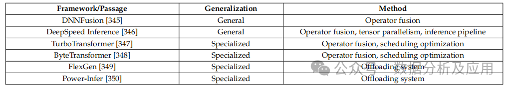 在稀疏MoE模型领域,研究人员探索了将传统模型压缩技术引入MoE模型的几种方法。其中,Switch Transformer将大型稀疏模型转化为小型密集模型,DeepSpeed-MoE将大型教师MoE模型转化为具有较浅专家网络的小型学生MoE模型,并采用阶段式KD训练策略。MoE模型的剪枝旨在去除冗余或影响较小的组件,而Z-code尝试了两种专家选择方法:随机选择和基于验证集利用率的选择。这些方法在保留MoE模型质量的同时,减少了内存消耗和资源消耗。实验结果表明这些方法的有效性。随着Transformer模型的发展,各种模型层出不穷,但由于应用场景不同,对延迟、吞吐量、内存等有额外要求,导致模型难以部署。本文介绍了一些针对LLM的推理加速框架,这些框架在不同场景下有效提高了模型的效率。我们将框架分为一般框架和专用框架,并根据泛化性进行了分类。表6 各种加速框架的总结