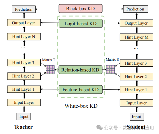 非结构剪枝方法回避微调过程,采用回避微调过程的方法,如表3,可以在模型性能相对折衷的情况下达到50%的稀疏度比率。后续的非结构化剪枝方法在各种NLP任务中超越SparseGPT和Wanda,获得优越结果。这些非结构化的剪枝方法需要最少的校准数据,可分为基于规模的剪枝和基于损失的剪枝。基于规模的剪枝。基于规模的剪枝是一种基于权重大小的剪枝方法,它通过剪枝权重较小的神经元来减少模型的大小。在LLM中,这种方法通常结合激活值来评估神经元的重要性。Wanda和RIA等方法使用权重和激活值的乘积作为剪枝指标,而E-Sparse方法还引入了信息熵作为剪枝指标。基于损失的剪枝。基于损失的剪枝方法,包括一阶和二阶方法。其中,二阶剪枝方法包括OBD和OBS,而SparseGPT将OBS应用于GPT家族模型,无需微调过程且不会损失太多精度。此外,还介绍了LLM外科医生对无结构和结构剪枝的通用性,以及基于梯度的一阶剪枝方法。Shao等人引入了新型剪枝度量,为剪枝过程提供全面和精细的评估,并提出了稀疏性比率分配给每个矩阵的方法。LLM的结构剪枝方法,不受硬件限制,能够在剪枝过程后实现推理加速,但需要微调过程来恢复性能。这种方法开创性的方法有LLM-Pruner,作为后续方法的基准,促进了有意义的比较。微调在非结构剪枝中已被废弃,但在LLM中广泛采用。LLM的结构化剪枝包括基于规模的剪枝、基于损失的剪枝和正则化。基于规模的剪枝。基于规模的剪枝方法将行或列作为剪枝单位。例如,FLAP方法以列为剪枝单位,通过“波动度量”来测量每个列的重要性得分。波动度量是输入特征的样本方差,与权重矩阵相应列的平方范数相关联。此外,FLAP还引入了偏差补偿机制,以消除组件删除所带来的负面影响,从而避免了微调的必要性。基于损失的剪枝。在应用于LLM的基于损失的结构化剪枝方法领域中,梯度信息至关重要。现有方法以不同方式利用梯度信息,如定义剪枝结构、选择剪枝目标等。与传统方法相比,这些方法避免了预定义的剪枝单元,能够动态识别和指定剪枝单元。例如,LLM-Pruner在修剪过程中移除非关键耦合结构,通过结构依赖性的定义自动识别和提取。LoRAShear在依赖图中发现最小删除结构,专门针对LoRA模块构建依赖图,利用知识分布分析来识别关键结构。Ji等人提出了一种新颖的方法,使用非神经模型,特别是梯度提升决策树(GBDT)作为精度预测器,进一步优化搜索空间和搜索过程,以自动识别最佳修剪模型。正则化。剪枝LLaMA和Compresso都是应用于LLMs的正则化方法,其中剪枝LLaMA通过联合修剪粗粒度和细粒度模块,引入了目标结构剪枝和动态批量加载两个新颖组件,实现了紧凑替代方案并优于从头开始训练的模型。而Compresso将LoRA集成到L0正则化中,通过协作剪枝范式提高LLM在剪枝过程中的理解和合作,从而提高性能并适应修改后的模型结构。两者都利用了剪枝技术来优化模型结构并加速训练过程。为了增强LLMs定制修剪方法的效果,已经开发出多种辅助技术,包括定制稀疏性比率、后修剪微调方法和硬件优化。这些技术可以与现有方法集成,增强整体修剪效果。其中,一种定制稀疏比率的方法是“离群加权分层稀疏”(OWL),它根据每一层观察到的离群比率定制非均匀分层稀疏比率。另一种后修剪微调方法是“动态稀疏无训练”(Dynamic Sparse No Training),它引入了无需训练的微调方法,可进行轻微更新并最小化重建误差。实验表明,这些技术能够显著提高现有剪枝方法(如Wanda和SparseGPT)的性能,说明剪枝性能的潜在提升可以通过与剪枝方法核心无关的手段实现。尽管LLM领域在修剪方面取得了一定成果,但仍面临两大挑战。首先,将修剪与其他方法(如量化和知识蒸馏)相结合对于实现竞争力强的性能至关重要。当前LLM修剪的成果相对不太令人满意,因此,增强修剪方法的内在有效性,确保其独立使用时的熟练程度是关键。其次,LLM修剪中的微调成本是一个重大挑战。许多方法采用一次性修剪而无需微调来最小化计算负担,但这会损害修剪模型的性能。科研人员和从业人员必须应对无法执行完整微调的挑战,特别是当处理旨在增强修剪性能的LLM时。解决这些挑战对于提高修剪技术的有效性和实用性至关重要。知识蒸馏是一种将教师模型的知识转移给学生模型的技术,通过简化学生模型,使其能够以更简洁和更有效的方式表示教师模型的知识。知识蒸馏主要分为以下四类:基于逻辑的知识蒸馏(logit-based KD)、基于特征的知识蒸馏(feature-based KD)、基于关系的知识蒸馏(relation-based KD)和黑箱知识蒸馏(black-box KD)。前三种蒸馏方法属于白盒蒸馏,需要访问教师模型内部数据。而黑盒知识蒸馏则是通过教师模型的预测结果来传递知识,不需要访问模型内部数据。当代封闭源大型模型内部信息不可获取,只能得到预测结果。黑盒知识蒸馏是一种有效的知识传递方式。在图5中,我们简要概述了这些知识蒸馏方法及其之间的关系。