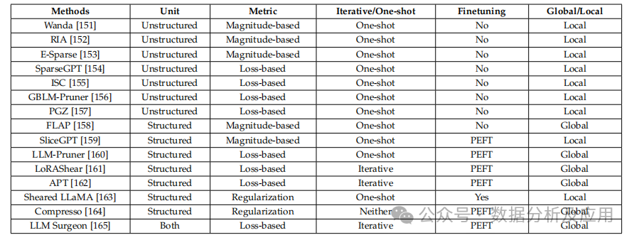 非结构剪枝方法在高稀疏度下保持模型性能,但面临推理加速挑战。N:M稀疏性原则通过要求连续的M组权重中不超过N个权重具有非零值,实现有效的推理加速。这种压缩依赖于硬件的独特架构,如稀疏张量核心。N:M稀疏性与非结构化修剪方法无缝集成,提供推理速度提升。例如,稀疏模式可以基于权重的幅度进行初步确定,2:4稀疏性在没有牺牲性能的情况下,展示了计算速度的两倍显着加速。结构化剪枝在应用于中型语言模型时,选择适当的剪枝单位与度量同样重要。通常考虑的剪枝单元包括注意力头、全连接层神经元、隐层维度等。使用与架构相关的结构作为剪枝单元能产生更理想的结果,因为这可以保留模型构造中固有的基本原则。接下来将深入探讨结构化剪枝的领域,包括基于权重的剪枝、基于损失的剪枝和正则化技术。基于权重的剪枝。修剪单元权重的加权和可以作为有意义的表示,这可以广泛地应用于CNN中的卷积核。同样地,也可以将其扩展到中型语言模型。例如,可以将权重大小与L2范数进行加权和,以表示注意力头、FFN神经元和权重块中的相应重要性。然后,根据其重要性得分的顺序去除不重要的结构。基于损失的剪枝。基于损失的剪枝方法在注意力头部得到了关注,其中米歇尔等人提出了一种迭代剪枝方法,剪枝注意力头部的20-40%不会显著损害目标任务上的测试准确性。然而,可区分子集剪枝表明,米歇尔等人对可剪枝的Transformer头数量做出了显著低估。此外,块移动修剪方法通过考虑任意大小的块并集成到运动修剪中来扩展结构方法。同时,也有许多方法同时修剪FFN中的神经元和注意力头。一些结构化剪枝方法可以泛化,因为其中的剪枝单元是神经元,例如稀疏与低秩逼近在神经元级别剪枝权重矩阵。正则化。除了基于损失的剪枝方法,正则化方法也是适用于中型语言模型的有结构剪枝技术中的一类。其中,L0正则化因其广泛的应用而脱颖而出。这些L0正则化方法主要应用于剪枝注意力头和FFN神经元,并使用低秩剪枝和增广拉格朗日方法来调节稀疏度比率。此外,L1正则化也得到了相关研究,通过稀疏性诱导的目标学习可压缩组件的掩码,得到不同大小的剪枝模型。这些剪枝后的模型随后可以通过因果传递目标进行微调以提高性能。其他。结构化剪枝还有层修剪、令牌修剪等方法。层修剪的特点是规模相对较小,需要更详细的修剪方案来确定哪些应该被修剪。令牌修剪则涉及在推理过程中从序列中删除不重要的令牌,以减少计算需求。学习令牌剪枝(LTP)是一种直接有效的方法,用于根据输入序列穿过转换器层的情况来适当地删除不重要令牌。每个令牌的剪枝度量由Transformer块中归一化注意力概率的总和确定。除了这些,结构化剪枝还包括许多不同的单元,例如谱归一化身份先验(SNIP),它采取了一种策略来剪枝注意力层和FFN子层,即将残差连接转化为严格的身份映射。在这一部分,我们将介绍针对LLM的剪枝方法,反映中等规模语言模型剪枝方法部分中建立的顺序。针对LLM的剪枝方法采用与中等规模语言模型所使用的并行方法相同的方法,某些方法中的一些区别主要在于省略微调过程。为了便于对这些方法进行更全面的比较,我们将这些剪枝方法的特性进行了整合,具体可见表3。表3 对LLM的各种修剪方法的总结