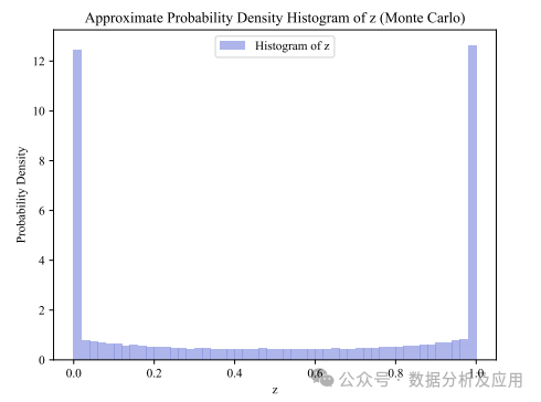 图4 使用蒙特卡洛模拟对硬混凝土分布的近似概率密度直方图。该硬混凝土分布的参数为对数α=0,β=0.5,γ=−0.1,和ζ=1.1。在该规格下,硬混凝土分布大致将其质量的一半分配到{0,1}中,其余分配到(0,1)中。