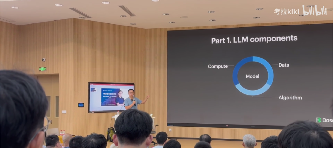 Hi!大家好,说我是计算机杰出校友有点不敢当。很多年没有回来,这次回国想见一见本科导师。我的 AI 启蒙导师李老师说,来都来了,要不做个报告吧。本来我想讲一些关于语言模型的知识,但听讲座的各位不一定都是这个方向,所以我加了一些这些年转了很多地方、做出的不同选择的感想。第一部分我会讲得稍微技术一点,是有关整个语言模型的现在,以及未来情况的预测。语言模型可以分为三块:算力、数据和算法。所以语言模型也好,整个机器学习模型也好,本质上就是把数据通过算力和算法压进中间那个模型里面,使得模型有一定的能力,在面对一个新的数据时,它能够在原数据里面找到相似的东西,然后做一定的修改,输出你要的东西。