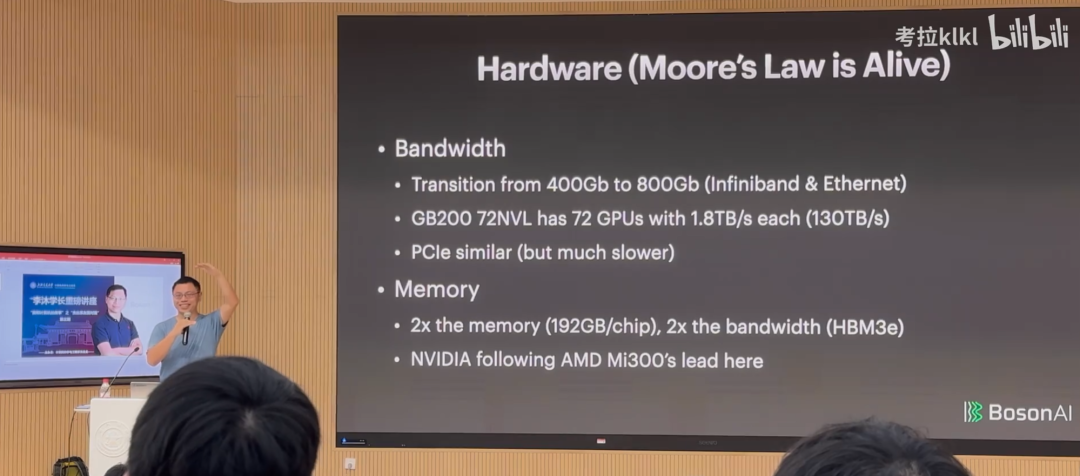 半年前,英伟达发布了一个名叫 GB200 的系统(现在已经推迟出货)。不知道大家有没有见过 GPU 长什么样子?这些机器其实是很高的。以前你去数据中心,会看到一个机架柜可以放很多很多刀片服务器。现在换成新的 GPU 之后,一个机架位只能放两台机器。这是因为供电、散热等等一系列的问题。英伟达可以把 72 块卡压缩一个机架位里面。这里面用到了水冷工艺。之前我们其实不太用水冷,因为水冷有很多问题,比如那个阀门没做好就会漏水,整个机架位一漏水就完了。而且水冷对整个基建是有要求的,水要进来要出去。水的好处是可以带走很多热量。现在我们大部分是靠空气吹,但水的密度更高,所以它带走热量的能力更强。所以一旦用到水冷之后,你的算力就可以更密,就可以放更多机器。芯片就可以压得比较扁。压得比较扁的好处就是,每个芯片之间更近了。芯片之间直接用光纤,以光速互通。光速你看上去很快,但实际上在我们眼里已经很慢了。一台机器传输到隔壁一米之外的机器所带来的几纳秒延迟,几乎是不能忍。我们自己去设计机房的时候会考虑光纤的长度,因为一米的差距就会给分布式训练带来一个可见的性能影响。英伟达的 GB200 这个卡就可以把 GPU 都放一起,那么它们之间的通讯会变得更好一些。你可以理解成:之前我们做多核,把单核封装到一个芯片里面,现在是说多核不够,我要做多卡,多卡以前是分布在一个房间里面,现在是多卡也要尽量放在一起,这是一个趋势。就是一块芯片那么大,早就做不上去了,这是台积电等面临的工艺难题,现在是尽量把这些东西弄得近一些。还有一个通讯是 GPU 和 CPU 之间的 PCIe,它每几年也在翻倍,但是确实会慢一些。接下来讲内存。内存比算力也重要一点。因为现在的语言模型,核心是把整个世界的数据压进模型里面,那模型就被搞得很大,几百 GB 的样子。在运行的时候,它的中间变量也很大,所以它就需要很多的内存。现在我们可以做到一个芯片里面封装近 192 GB 的内存。下一代带宽会更高一点。但这个东西目前已经被认为是一个瓶颈了。这是因为内存占面积 —— 一个芯片就那么大,划一块给算力,划一块给内存之后就放不下什么东西了。所以很有可能在未来几年之内,一个芯片就 200GB 内存,可能就走不动了。这个要看工艺有没有突破。这意味着我们的模型大小在一定程度上会被限制在一个尺寸,因为更大的话你的效率会变得特别低。所以内存大小会是模型上限的一个制约,而不是算力。我们是内存不够,模型就做不大。在这一块,虽然英伟达是领先者,但其实英伟达是不如 AMD 的,甚至不如 Google 的 TPU。机器学习好的一点是,你可以用 4 位浮点数,硬件会变小,它对带宽的利用率也会变低,因为每次计算它只有那么多浮点数在里面。所以我们最近几代优化都来自浮点数的精度的降低。这是它给硬件带来的好处。但是当你把模型做得更大的时候,你会发现资源是问题,就是供电。我们自己在做数据中心的时候,曾经真的想过我们自己造一个电厂。当我们发现自己去造一个电厂的成本比我们付的那个电费成本还低的时候,我们花了几个月时间去看那个电厂文件。最大的一个芯片要耗一千瓦,一千块芯片就是一兆瓦,整个校园都未必能用上一兆瓦的电。关于算力价格。从理论上来说,在公平的市场里面,每次算力翻倍,价格会保持不变,充分竞争的市场会有这个好处,在过去很多年都是这样。但是最近几年英伟达的垄断导致这个价格下不来。短期来看,算力翻倍,价格可能会有 1.4 倍的提升。但是长期来看,当竞争变得越来越激烈,摩尔定律会发挥作用,就是说算力翻倍,价格不一定变。所以长期来看算力会变得越来越便宜。算力这块,你可以用别的芯片,但是这些芯片用来做推理还 OK,做训练的话还要等几年的样子,英伟达还是处在一个垄断的地位。