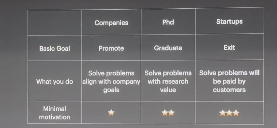 从最基本的目标来说,去大公司,是为了升职加薪;读 PhD ,你要保证自己能毕业;而创业的目标是要能推出产品,要么上市,要么卖掉,这是每天都需要思考的。在大公司,你要解决问题。大家一定要想清楚:我要在公司干什么,公司今年准备干什么,最好两者保持一致。如果干的事情是自己喜欢的,但不是公司追求的,这就会让人很难受。创业公司面临很多问题,用户会付钱吗?投资人会付钱吗?要是都没人付钱就糟糕了。虽然进大公司和创业,都是解决问题,但解决的问题不太一样。你想解决什么问题,就会导致你选择做什么样的事情。比如说,去大公司,你不要只想着家里没矿,找个班上赚点工资。你的动机得高一点,不仅仅是为了赚那点钱。