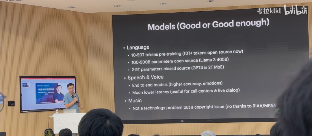 接下来讲模型,比如说语言模型。每次预训练,无论是 OpenAI 还是别的模型,基本都是用 10T 到 50T token 做预训练。开源的话基本也在 10T token 以上。这个数据量我觉得差不多了,不会再往一个更大的尺寸去发展。原因是,人类历史上的数据比这个多是多,但是看多样性、质量的话,我觉得 10T 到 50T 这个规模就差不多了。你说我还是能弄到很多的数据进来,但这个数据质量不一定能给你带来一个更好的提升。也许你可以弄到更多的数据,但是清洗之后可能会回到一个这样子的值。你的模型大小就是 100B 到 500B 这个样子。我觉得比较好的一线的模型就是 500B,超过 500B 不是训练不动,而是做 serving 很难。在谷歌历史上,他们就没有让 500B 以上的模型上过线。OpenAI 没有对外说,但我觉得 OpenAI 历史上没有上线过有效大小超过 500B 的模型。当然 MoE 不算,我是说换算成稠密模型的话。所以,很有可能在未来一阵子,因为受限于内存大小和数据的尺寸,我觉得 100B 到 500B 会是未来主流的一个大势。你可以做更大,但是它很多时候是用 MoE 做的,它的有效大小(每次激活的大小)可能也就是 500B 的样子。GPT-4o 出来之后,大家对于语音模型产生了浓厚的兴趣。以前的模型是我先做 ASR(自动语音识别),把语音信号转成文本,然后放进语言模型,让它出一个文本的回复,再通过 TTS 变成一个语音的信号。现在大家做的是直接让你的原始的语音信号进去,然后原始的语音信号再出来。后者的好处有两点:一是我们说话的时候,其实里面包含了很多东西,包括情绪、语调以及你是哪一类的人。大家能够通过声音去分辨你的方言,通过你说话的音调能大概知道你是一个什么样的人。所以人的语音信号里面包含很多东西,还有你的背景音乐、场景音乐,甚至你唱歌的节奏感都有很多信息在里面。目前我们那一套传统的技术是做不了的。这套新的语音技术可以让语音直接进去,然后利用文本语言模型强大的能力去发掘里面的信息。在做输出的时候也是一样的,我的输出可以根据你的输入的个性化场景来变换语调、情绪。这是一点。另一点是延迟更短。之前我要先输出一句话,再进到一个模型去把语音输出来,这个延迟可能是 1 秒。现在我们大概可以做到 300 毫秒。300 毫秒最大的好处是可以打断。人与人之间交互,就我跟你在说话的时候,你说一句,我可能会回应一下,或者中间会打断,所以这个体验就会做得更好,更像真人一些。还有一点就是说,它能够通过语言模型对整个输出做很多控制。可以让你用文本定制化一个什么样的声音出来。另外一个国内在商业上做得挺好的东西就是音乐的生成,最近出了挺多做音乐的一些工具。我觉得这一块的进展从来不是一个技术问题。它的技术其实比语音麻烦一点,因为音乐比人说话更复杂一点。但是实际上它还是一个版权的问题。现在大家开始慢慢解决版权的问题 —— 大公司去买版权,小公司想反正我光脚不怕穿鞋的,我就上。市面上我觉得已经很好了,就是说抖音快歌,虽然爆款很难,但是如果你不是音乐专业的人,你听下来觉得没什么问题。我之前看一个同事写首歌,歌词大意是:我在公司就一个朋友,这个人去吃饭了,一个半小时还没回来,我觉得他是不是出什么事了?我是不是要打电话给他女朋友问一下呢?但我又是一个很社恐的人,我又不敢跟人打电话。就是说,音乐是一种表达,是一个人的交互,任何一个什么感觉你都可以通过音乐表达。以前你很难用音乐把它很富有情感地表达出来。大家可以写诗,写诗可能比音乐容易一点,现在你掌握了这个表达工具之后,我们未来很多人会用音乐这个形式来表达想法和情感。我觉得这个可能是影响力会特别大的,那它不是个技术问题,它可能还是一个商业问题。接下来是图像。可能大家最近几天都看过那个做得很真的 TED 演讲的图片。