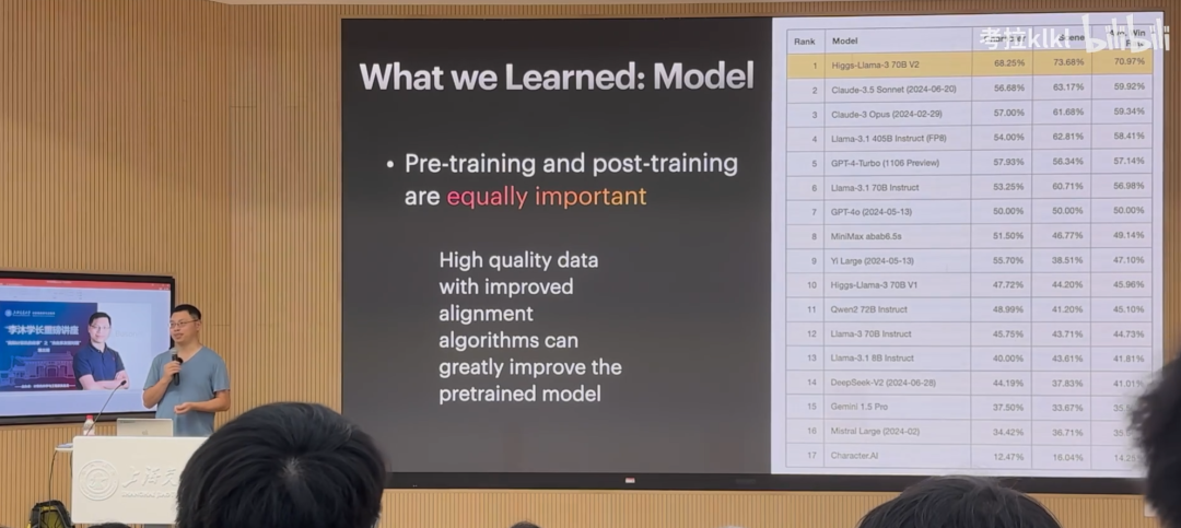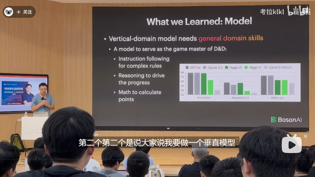 首先第一点:之前大家会觉得预训练很重要,比如训练一个几百 B 参数的模型,现在在我看起来预训练是一个工程问题,后训练才是一个技术问题。但在两年前预训练还是一个技术问题,现在我觉得变成工程问题了。对于后训练,高质量的数据和改进的算法能够极大地提升模型效果。高质量的数据一定是结构化的,并且与应用场景高度相关,以保证数据的多样性和实用性。在算法层面,OpenAI 提出了 RLHF,大家给予很高的评价。但当我看到这个算法时,我觉得这个算法有点牵强。这套技术在几年之内发生了非常大的变化。但到底哪个算法好,我也说不出来。原因在于每个人用的数据不一样,导致算法所适用的场景不一样。以至于你在读一篇论文的时候,可能在论文中效果很好,但自己实际用时,发现根本用不了,原因在于用的数据不一样,目标函数对这个结构化问题的假设不一定对应的上,导致算法不太行。这个问题没办法规避,就是一个技术问题,就得去做研发。如 PPT 上的图所示,我们拿 llama 3 70B 微调了一个模型,进行角色扮演(如老师、销售等)。我们直接在 llama 3 base 的基础上做后训练,微调了两个版本 V1、V2,目前 V2 在角色扮演上优于其他模型。作为创业公司,我们没有多少资金。LLAMA 团队标注数据就花了 5, 000 万美金,然后做训练,但是你会发现他们的数据并没有变得多好,而且 Meta 也没有花太多时间在算法上面。做大语言模型的研究,你可以不去做预训练,你就做后面的一部分,因为后面部分其实对大家有利的。前面变成了一个工程问题,需要很多卡,很多人来完成,后面才是算法创新。虽然它的门槛还是比较高的,8B 和 70B 的情况也不一样,8B 上调的很多东西在 70B 上不一定成立。