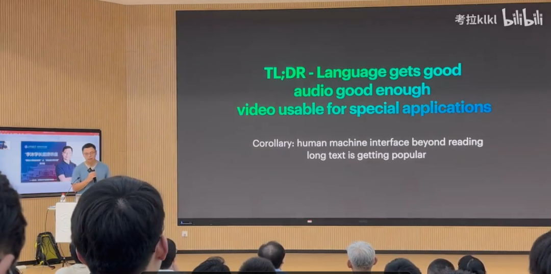 总结下来,我觉得语言模型已经达到了较高的水平,大约在 80 到 85 分之间。音频模型在可接受的水平,处于能用阶段,大约在 70-80 分之间。但在视频生成方面,尤其是生成具有特定功能的视频尚显不足,整体水平大约在 50 分左右。还有一个推论是我觉得人机交互会有一点改变,比如在点菜时,在 ChatGPT 出来之前我们与手机的交互方式是刷刷刷和点点点,这是最简单的方式,对人类来说也不耗费精力,能不说就不说。但在 ChatGPT 出来之后,大家打破了这种观念,他们愿意去输入一段很长的文字去做事情,这是因为设计好的东西不一定满足我们的所有需求,可能满足了 80%,但没有满足对细节的需求,这时可以通过长文本,即输入很长的文字来解决。但输入长文字还是不如说话方便,所以在微信上很多人会说我语音留言会方便点。现在语音技术正在进步,未来大家可能会越来越能接受对方用一个很长的语音跟你描述一些事情,让你去完成。虽然早期的语音控制系统通常只用于执行简单的指令(例如「开窗」),这种简单的功能并没有形成强烈的用户黏性,因为用户可以通过其他简单的操作来完成相同的任务。但是,随着技术的发展,未来的语音控制系统将能够处理更加复杂和具体的任务,这种技术的自然和便捷性将显著提高。所以这是用户习惯问题。大家可能都在说我们这一次的技术革命还没有出现 killer APP(杀手级应用)。所谓的 killer APP 就是说一个技术的出现,可能会涌现出一个非常受欢迎的应用形态。大家知道手机的 killer APP 是什么吗?短视频。回想一下五年前,你可能很难想象大家会刷那么几秒钟的视频。上一波的顶级 AI 公司基本上快死得差不多了,包括 Character.AI、Inflection 被卖了,Adept 也被卖了,还剩一个 Perplexity 搜索还在支撑着。但是下一代 killer APP 是什么大家不知道。可能等技术变成熟,大家的不习惯慢慢地过去了,这个东西会涌现出来。