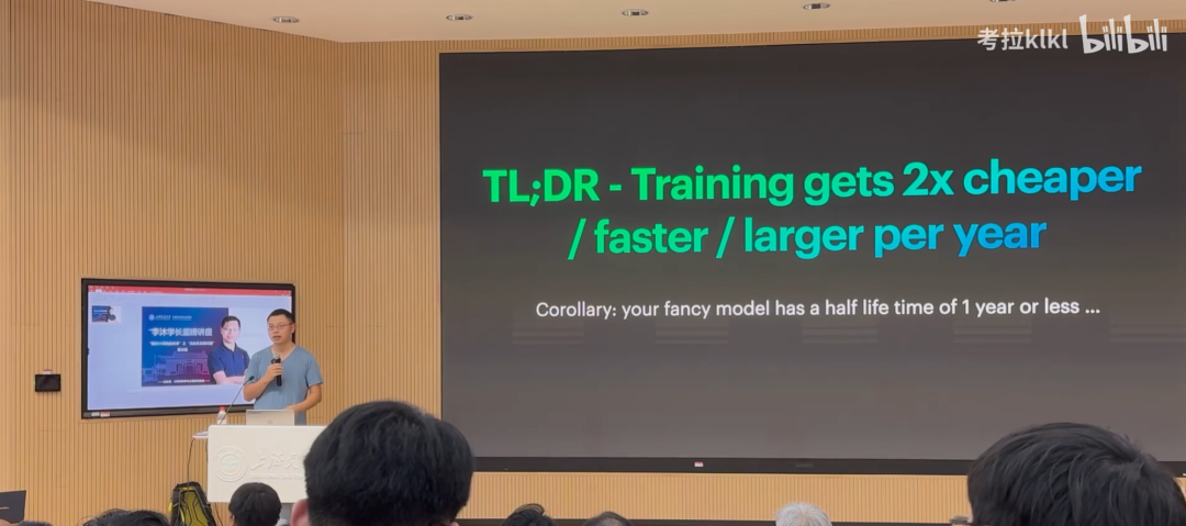 所以在算力这块,你可以认为摩尔定律还是会发挥作用,就是训练会两倍两倍地变便宜。所以你今天训练一个模型,一年之后它的价值会减半。很多时候,大家不要去想我现在能搞多大的模型,一年之后,这个模型会贬值。我想说,大模型不是特别有性价比的东西。你要想清楚,从长期来看,你的模型能带来什么价值,让你能够保值。