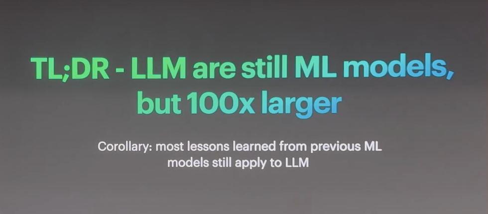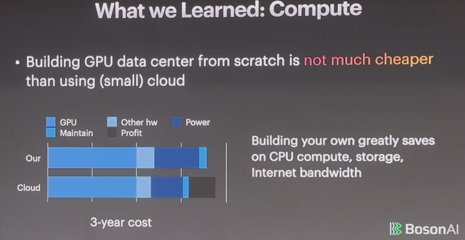 我是从 Amazon 干了 7 年半才出来创业,但我其实不用 Amazon 服务,太贵了。我们都用小公司买来的,他们当年用来挖比特币的。你自己运营的话贵一点点。运营是个体力活, GPU 每天都坏,我们的机房放在多伦多,有三个人三班倒,坏了就跑过去把机器修一下。云当然还赚了一点钱,但也赚不多,有 20% 的利润,所以在这一块看上去是差不多的。但自建的好处是能节省 CPU 的算力,以及你的存储和网络带宽。这些方面,自建就很便宜,但云就会很贵,因为这块在过去十年没有太大技术变革。比如说我用 AWS,存一年的数据成本等价于我把存这个东西的硬件买回来,而且能够容量变 10 倍。当你数据量增长很大的时候,自建是有意义的。如果你去看语言模型,它就是一个机器学习模型,换了一个架构,只是更大了,带来很多困难,但它本质上还是可以用传统的机器学习那一套去理解的。它还是吃数据,评估还是很重要,所以很多之前的经验还是能用过来的。所以大家不一定要神化新的技术带来什么东西。但是它的困难在于,它是之前的 100 倍大,模型变大就会变得很难,这是它目前主要的问题。在预训练方面,我觉得现在已经变成一个因为大而导致很多工程问题的困难,这其实还是算法上探索不够,得清楚如何改进算法,以上是我们在技术上的一些分享。