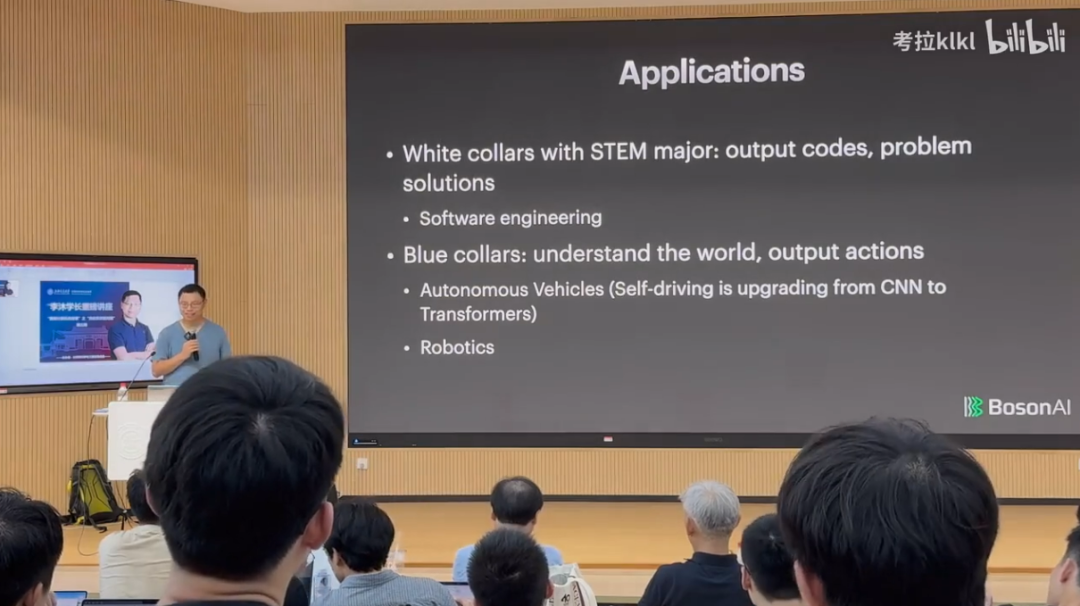 第二个是工科白领,目前 AI 想取代程序员还早得很。在过去,编程往往需要程序员自行查找代码示例,例如在网络上搜索,然后下载一个工作流程的代码片段,对其进行变量修改和调试,以适应特定的任务或项目。但现在,先进的模型可以自动完成这些步骤。你不用去 copy 代码了,因为整个 workflow 已经给爬下来了,训练的时候已经在里面了。当你向模型提出请求时,它可以直接在其训练数据中检索相关的代码片段,根据上下文,再把变量名改一改,模型就做这种事。但它不是真的在写代码,我们人类一个小时还是能够写出很多复杂的代码的,所以我觉得模型还是没有取代工科白领一个小时干的事情,更不用说更复杂的任务了。最后一个是蓝领阶级,这反而是最难的,这里面唯一做的好的是自动驾驶。自动驾驶为什么这么出色?是因为路况相对来说是一个封闭的世界,比较稳定,比如有些地方路况十年都不会改变,所以在封闭路况里面开车相对来说是比较简单。虽然现在无人驾驶还没有完全解决,但进步还是很大的。路上的车多,每个车上都有传感器,从而采集大量的数据,基于大数据做技术开发,比如特斯拉,车上有大量摄像头,有很多车在路上跑,可以采集很多数据来优化算法,而且路况变化不大。但是正常的蓝领需要做什么事情?端盘子、运货等,AI 跟这个世界打交道是一件很难的事情。比如机器人进入一个房间,它要理解这个房间有什么东西其实很难。除非有技术突破,不然的话需要大量的数据作为辅助。这是一个鸡生蛋蛋生鸡的问题,如果房间内没有足够的传感器,就采集不了足够的数据,另一方面,一个房间里不可能有很多机器人进来,同样也无法得到很多数据,因而泛化能力不是很好。但是在物理世界投放 AI 机器人是一件很难的事情,可能需要很多年。所以 AI 理解蓝领的世界,包括和这个世界互动可能需要至少 5 年时间。