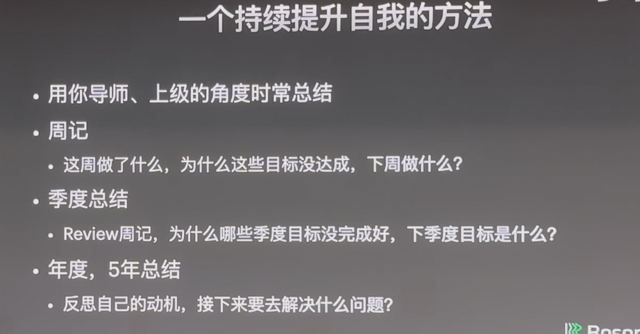 你用导师或者上级的角度去总结自己:你每周干了哪些事情?为什么这些目标没达成?可能是因为懒,那么你得直面懒的问题。我怎么能让自己勤奋一点?找一个学习伙伴,每天在图书馆待着,要大家相互监督等。还有可能是因为蠢,这就有两种解决方案。一种是换一个方向,去擅长的领域;一种是既然绕不开,那就花别人两倍的时间。无论是因为懒还是蠢,你都得对自己狠,最后拼的就是你对自己有多狠。你要形成一个习惯,定个闹钟,每周一晚上花 30 分钟对自己进行总结,每个季度要总结,翻看之前你的写的周记,看看这个季度的目标是否完成,下个季度要做什么。选择比努力更重要,但选择的前提是搞清楚你的目标是什么。此外,每年或者每五年你都得想一想自己的动机是什么?如果觉得去年不开心,没有做出什么成果,你就要思考一下,是不是你没有强烈的动机,或者时机不够成熟。要是因为时机不到,你就继续努力,如果是动机不对,那你就考虑换一个努力的方向。反正我每 5 年都会想一想,我动机是什么?我接下来要干什么?但这有个 bug ,就是我什么地方都逛了一圈,活成了「打卡式人生」。