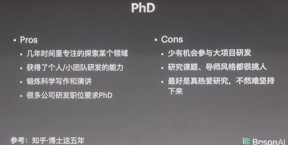读 PhD 的好处是,在几年的时间里可以专心探索某一个领域,反正也没钱赚,也没有升职加薪的机会。等完成 PhD 后,你可以获得个人或者小团队研发的能力,不少人可以自己哐哐哐做出东西来,也有些人可以去带硕士生、本科生或者几个人一起完成研发。大家可能没注意,PhD 有 50% 时间是花在写作和演讲上的,这种能力也很重要。还有一个好处,很多公司的研发职位要求就是 PhD。其次是研究课题和导师风格都很挑人,需要你去适应,这个适应过程,要么看你的适应能力有多好,要么看你导师的适应能力有多好。你在公司里面还能够部门之间跳一跳,但读 PhD 就更难一些。最后,要真的热爱研究,不然坚持不下去,你会觉得研究这个东西到底有什么意义,写这篇论文要干嘛。其实,你可以这样想:我写这篇文章就是为了练习写作,等到更厉害、更大的成果做出来后,写作不能给我拉后腿。你要有一个更远大的目标,是真的热爱它。创业:有「生死一瞬间」的刺激,也有「三小时醒一次」痛苦