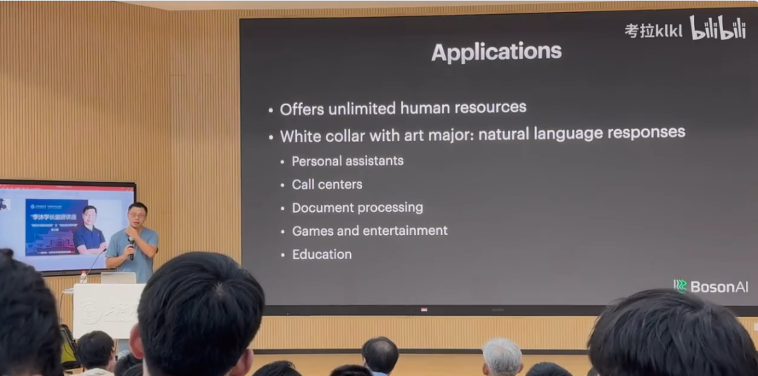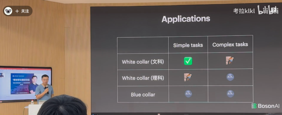在应用层面,AI 本质上是去辅助人类完成任务,给人类提供无限的人力资源。我将应用分成三类:第一类就是文科白领。白领是用自然语言去跟人、跟世界打交道,包括写文章或者其他。我认为在这方面做的比较好的领域包括个人助理、Call centers、文本处理、游戏和舆论以及教育。一个文科白领可能一小时完成的事情,我们的模型还是能够完成百分之八九十的。