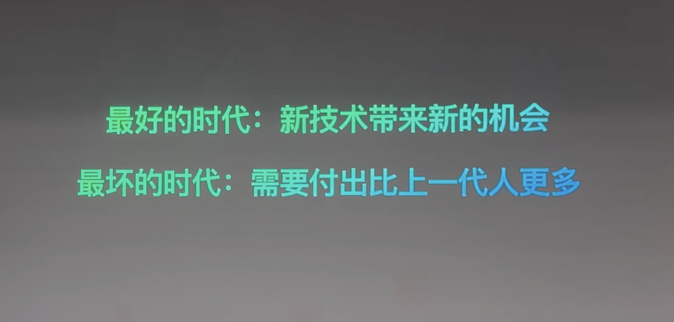 这是一个最好的时代,新的技术带来了很多新的机会,就算没有新一代技术出现,现有的技术对世界未来几年的影响都会非常大。这不是我一个人的看法,很多世界 500 强 CEO 也这么认为,他们内部的很多数据都验证了这一观点。因此,大家不管是读本科、硕士、还是 PhD,甚至刚工作,都能享受到未来几年技术带来的变革。同时,这也是一个最坏的时代,在座的各位付出的努力要比上一代更多。上一代吃到了时代红利,而到了你们这一代,时代红利还是有的,只是需要付出更多努力。原视频链接:https://www.bilibili.com/video/BV175WQeZE7Z/?spm_id_from=333.337.search-card.all.click本文根据视频整理而来,有听错或理解不当之处欢迎在评论区指出。