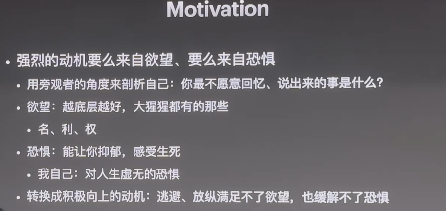 你要有一个强烈的动机,而强烈的动机要么来自很深沉、很底层的欲望,要么来自很深的恐惧。你用旁观者的角度来剖析一下自己,你最不愿意回忆或者分享的是什么,再去想一下这背后的动机,是想要什么还是怕什么?欲望是越底层越好,名、利、权,都是底层的欲望,要直面自己的欲望,也要直面自己的恐惧,这种恐惧是可以让你抑郁的恐惧,也是让你感受到生死的恐惧。你需要把欲望和恐惧转变成积极向上的动机,这一点很重要,你的动机一定是正确的,符合价值观的,因为逃避、放纵满足不了欲望,也缓解不了恐惧,唯一克服它的办法是,把它变成一个积极向上、符合社会价值的一个动机。