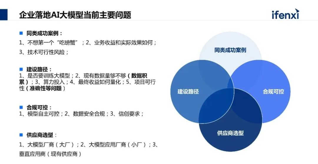 2、落地和建设路径方面有几个问题较受关注,第一,是模型本身,研发能力不足的企业用户,是否自身要去做模型训练?现阶段是否一定要有企业内部专属大模型?第二,如果做训练和微调,现有的数据量是否足够?第三,算力是否需要投入?如果增加算力投入,整体项目预算量级会上升一个级别。第四,如何量化最终收益?第五,是项目可行性问题,大多数企业用户在过去一年都已经做过大模型尝试,准确性、幻觉问题一直存在,如何解决?3、合规,模型本身是否自主可控?数据是否安全合规?信创要求。4、选型,现在市面上第一类大模型由互联网大厂,像阿里、腾讯、华为等大厂研发的相关产品。那第二类是专注单点应用的小厂,比如专注于 Agent 平台和 Agent 应用开发。第三,现有垂直供应商。所有企业用户都会关注选型问题,虽然大模型大厂本身技术能力很强,但不一定特别理解企业自身业务场景,而现有的垂直厂商本身技术能力会受到多方质疑,所以选型是重点关注的问题。
