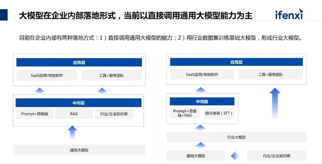 第二种落地方式是直接做微调训练或全参数预训练。有些企业选择精调,灌输行业或企业自己的数据集,给到技术大模型,精调后形成行业大模型或垂直大模型,基于之上提供服务,这两种是现在较常见的落地方式。