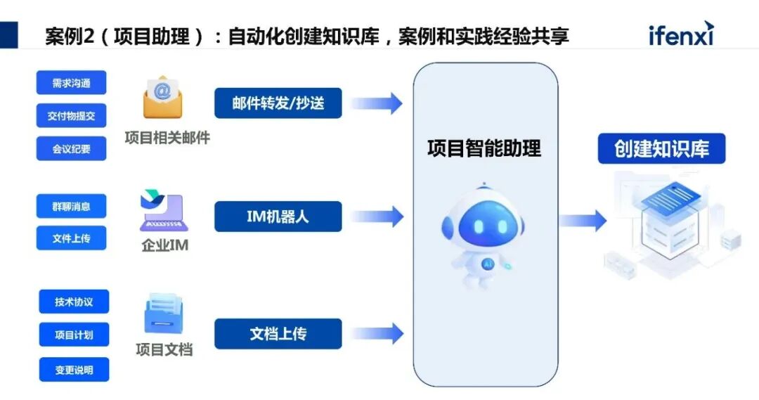 因为大模型擅长处理非结构化数据,客户落地项目经理为了进行交流和沟通,一类通过大量邮件交互,另一类是通过钉钉、飞书群工具。只需要助理快速处理邮件和钉钉群中的信息。一方面自动化将更关注的信息形成项目管理系统需填写的表单和文件,降低重复性劳动。另一方面,其中包含大量信息,信息的查找并不容易,可通过项目助理的交互,定期了解文档、项目的进度与风险点等信息。