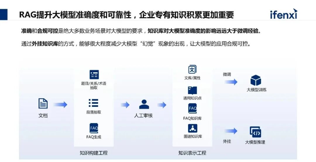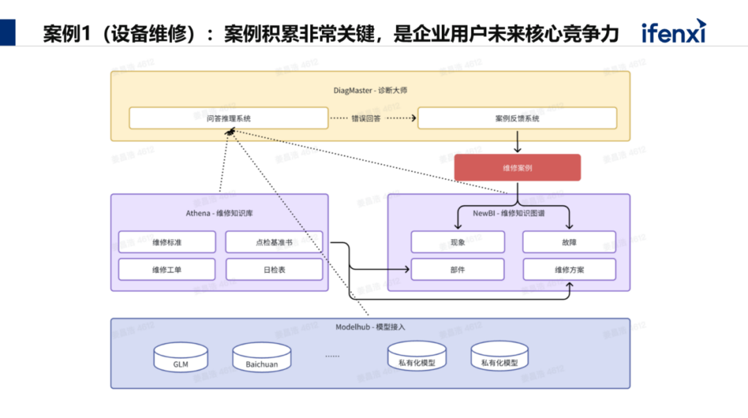 RAG 对企业而言是非常好的方式,现在企业面临的大部分场景是基于知识问答向上延伸的,比如设备维修、项目管理等案例,拆解成底层能力,本质上都会用到知识库检索。所以我们认为,RAG 是当前重要的落地实现手段。大模型准确性很大程度上依赖于知识库,其影响远远大于微调。其中企业专有的知识积累非常关键。但企业具体需要积累哪些知识?因为企业原有的积累知识,很多时候并不能完全满足用户实业需求。且现在RAG会做非常多工程化工作。比如设置拒答逻辑,让大语言模回答问题之后,完全只从知识库里检索,可以有效减少幻觉现象。包括合规、敏感词现象,都是工程化里较好实现的。简述下案例情况,当维修人员看到了些故障现象,需要根据现象诊断背后原因,同时基于原因给出维修方案和建议,定位更像是设备维修助手,辅助于工程师的场景。