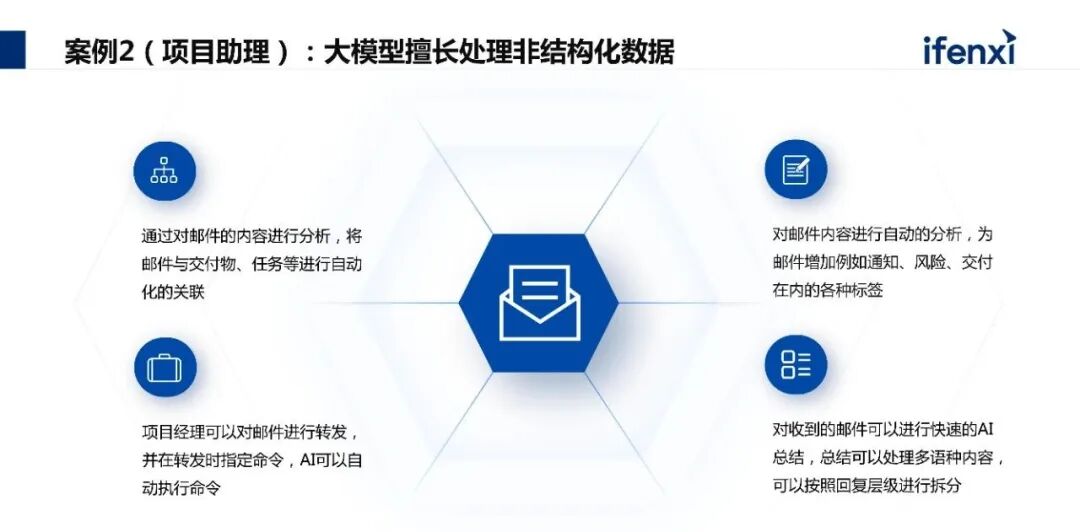 对于项目经理来说,能够帮助解答问答、降低劳动工作量、提升效率。从管理人员角度,真实性、时效性比原来有所提升。相对真实地反馈项目进度,数据对于管理人员来说是非常关键的,而系统里会存储时效性强的真实数据。项目助理背后会挂知识库,可以把项目经理的经验沉淀下,经验本身可以复用到其他项目。同时项目管理系统中的数据是真实的,可以做项目端的洞察,这些都具有价值,所以大模型的落地案例与现有数字化系统是很好的补充。项目助理类或助理类的 Agent 应用,第一出发点还是认为未来会作为入口,替换原有的数字化系统。但在落地时,我们认为其可行性不高,因为对于业务新人来说,熟悉新系统难度较大,所以当前阶段更好的方式是增强现有系统的能力,真正让一线人员便捷使用数字化系统或过往信息化管理系统,提升使用体验,这意味着可以存储更多真实数据,更真实地反馈实际情况,使系统未来的价值度更高。大模型擅长非计划数据处理,不擅长做数值计算,所以围绕着邮件、 IM 信息的处理是大语言模型擅长的。案例中体现的更多是对邮件内容的处理,包括加入自动化 RPA 工具,做自动转发,以及对于风险情况自动打标。