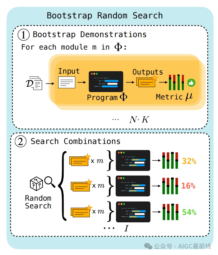 - 引导随机搜索(Bootstrap Random Search)首先通过引导演示过程为每个模块引导出一定数量的少样本示例,然后使用随机搜索在这些引导出的演示集上进行搜索,返回性能最佳的集合。