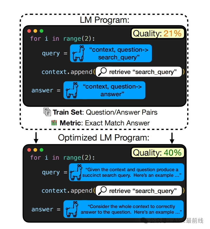 图1:优化问题的一个示例,以一个多跳检索语言模型程序展示。给定一些问答对和一个度量标准,优化器为每个阶段提出新的指令并引导新的演示(未图示)。
