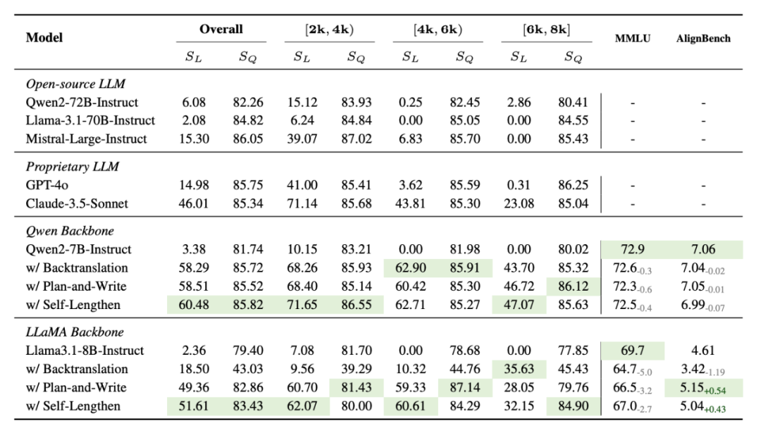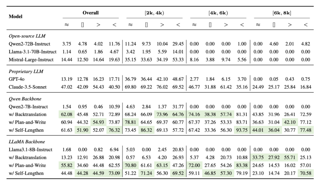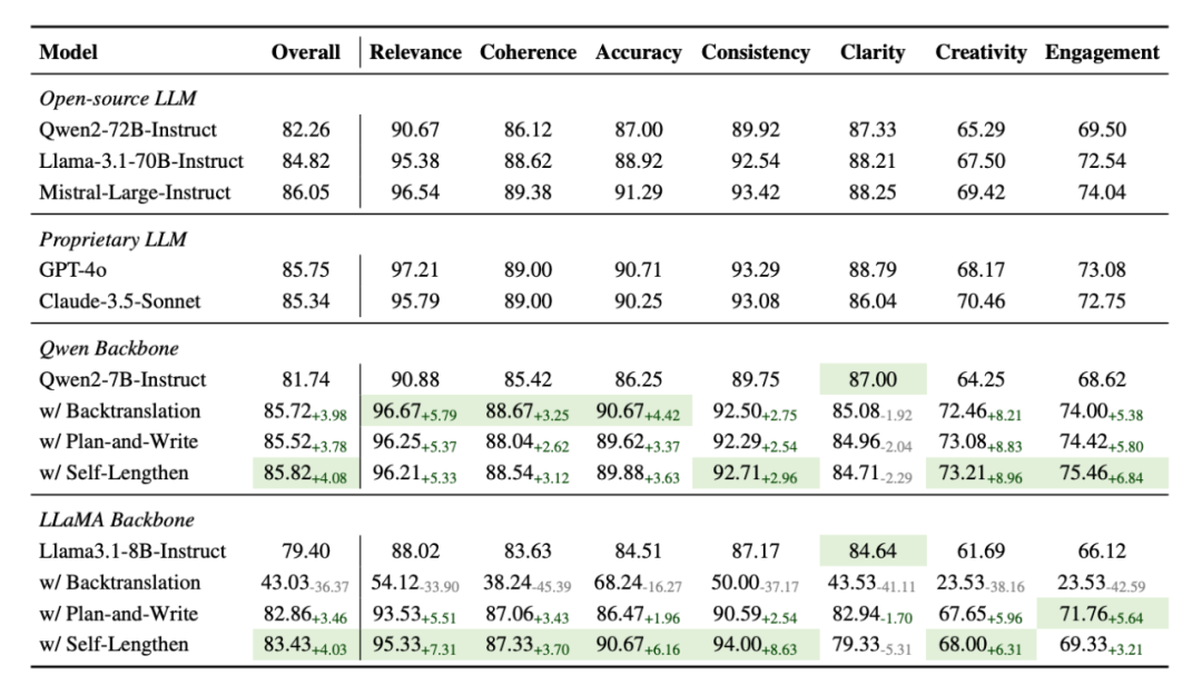 同时我们使用 GPT-4o 来对不同模型在回答相关性、准确性、创造力等七个纬度上进行打分来得到质量评估。我们发现我们的方法在 Qwen, LLaMA 基座模型上始终比其它方法有更好的长度遵循效果和质量评估分数,并在长输出任务上超过了其它的通用开源和闭源模型。