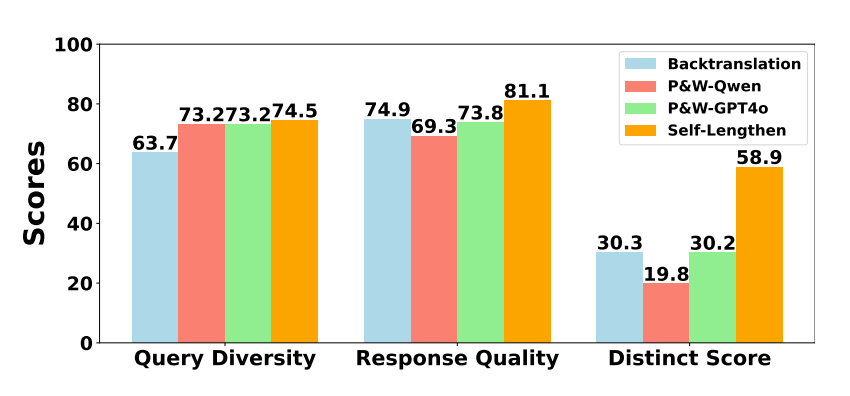 我们同时评估了构造的数据质量以及用这些数据训练模型的效果。在数据评估中,我们组织了数位志愿者对我们的数据以及其它方法构建的数据进行打分,对比数据中的问题多样性和回答满意度。同时,我们还统计回复的 Distinct 分数进行了比较。我们发现我们在几个纬度上均超过了其它方法,结果如图 4 所示。