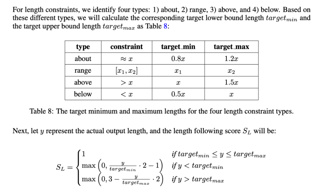 在模型评估中,我们首先构建了一个长生成能力的评估基准 LonGen,包含了文学写作、科研写作、情感表达等七类任务,并且在指令中都包含了明确的长度限制。根据模型的真实输出和不同的长度限制类型,我们根据图 5 提出的公式来计算模型的长度遵循分数。