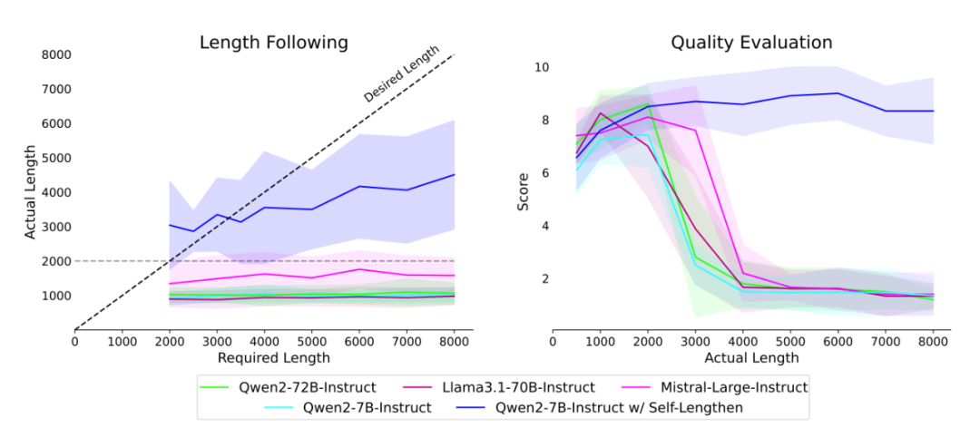 我们选取 10 条长生成指令进行测试,发现现有的主流开源模型都难以生成长文本;即使通过修改解码策略来强制让模型产生长输出,我们发现当模型输出超过 2000 字,输出的质量迅速降低,都出现了重复、乱码等问题。而使用了我们的 Self-Lengthen 方法进行长度扩充后,我们成功将 Qwen 模型的输出能力从 1000 字提升到了 8000 字(图 1)。