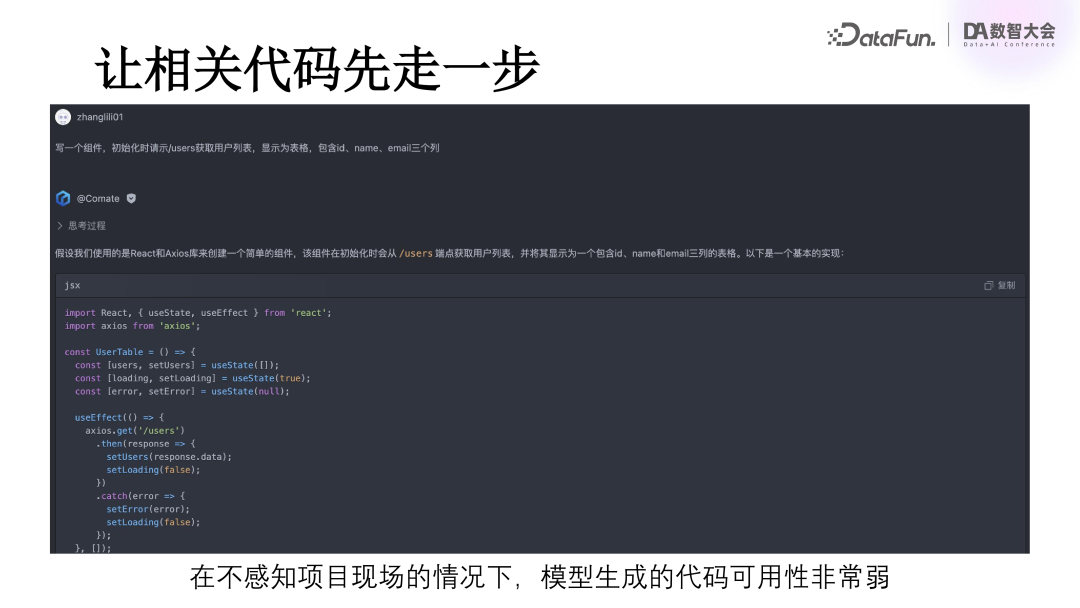 如果我直接对模型表述这个需求,模型可能会根据当前社区中最流行的技术方案来为我生成代码。例如,如果模型认为 React 框架很流行,且通常使用 Axios 来发送请求,那么它可能会按照这种方式来编写代码。然而,这样的代码在我们的具体业务中是否真正有价值呢?这并不一定。因为我们的业务可能会采用不同的社区框架,如果生成的代码没有基于我们实际使用的框架,那么这些代码对我们来说就可能是无用的。