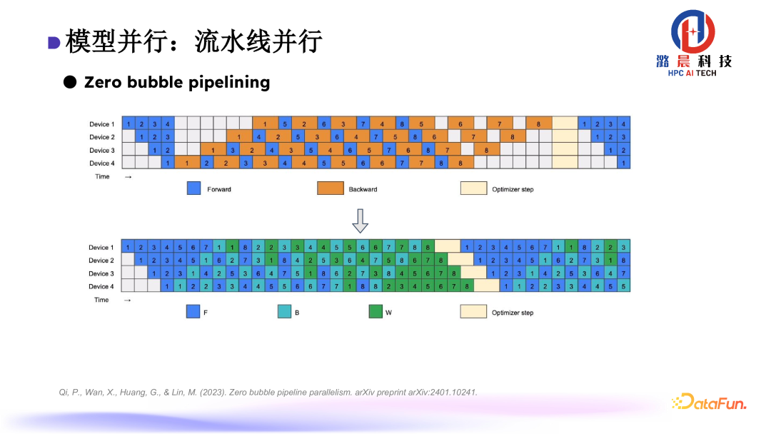 因此我们采用了 zerobubble 的 pipeline 设计。通过把反向的梯度拆解为参数和输入输出两部分,可以隐去流水线中的 bubble。
