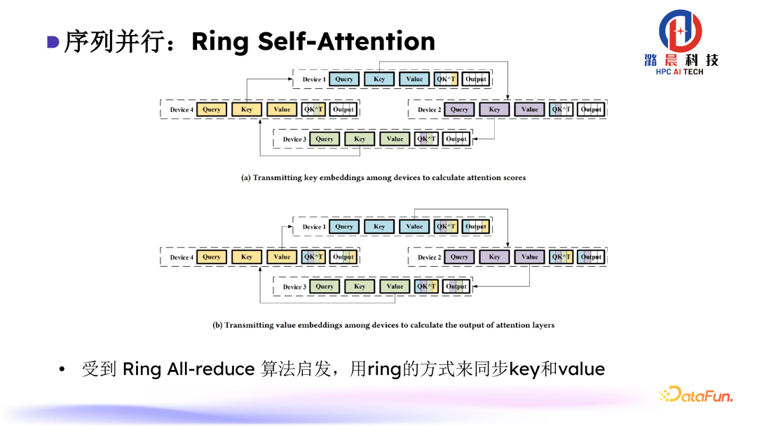 受到 Ring All-reduce 算法启发,我们设计了 Ring Self-Attention 算法,使用 ring 的方式来同步 key 和 value。通过比较少的通信量就可以完成一个完整的 attention 的计算。